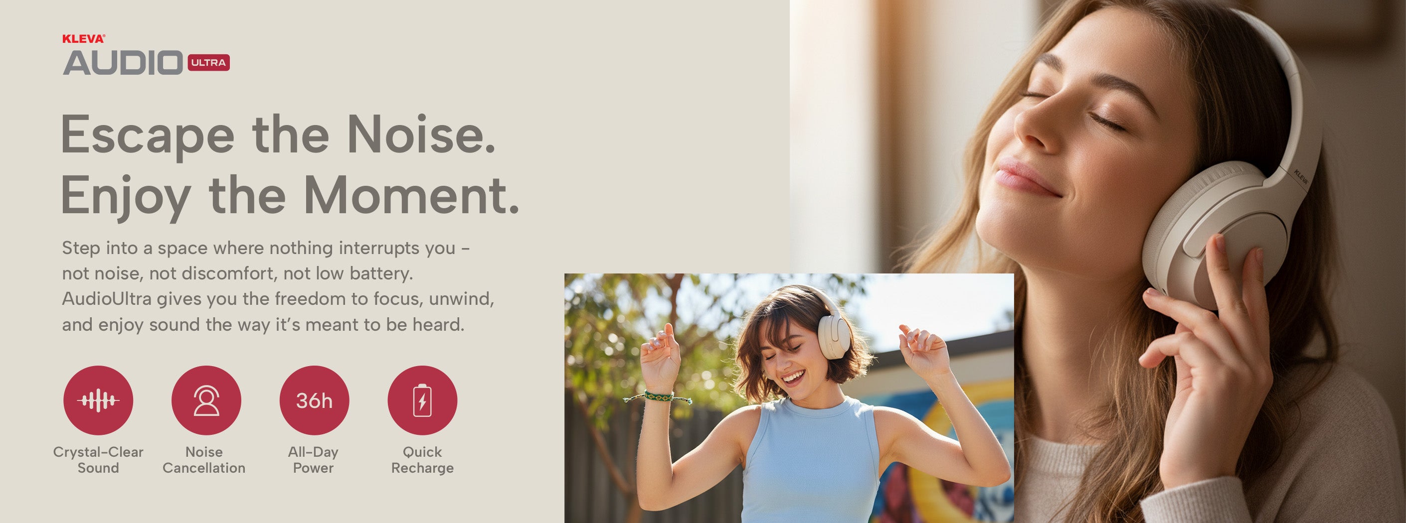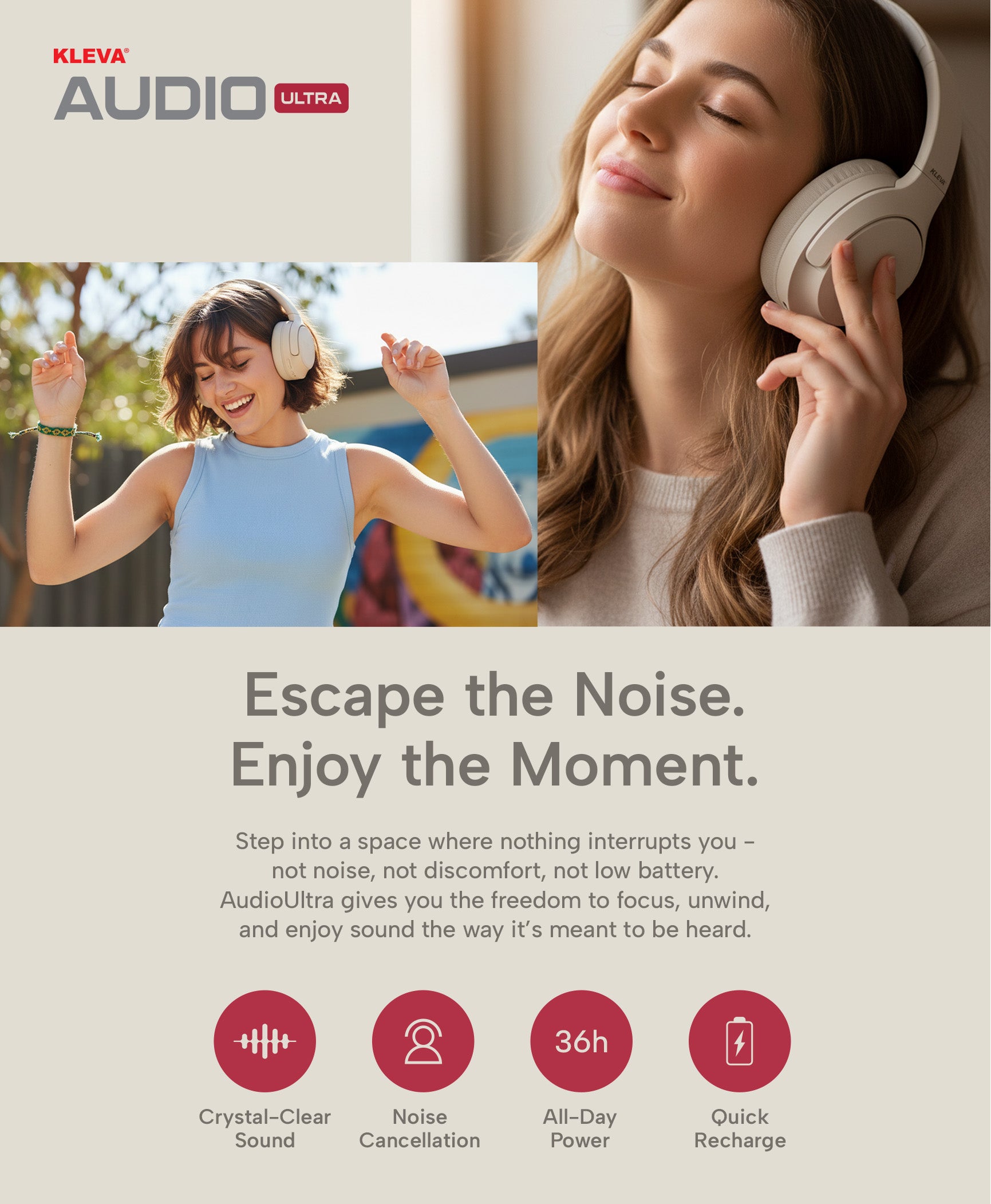 Tired of sore ears, slipping headbands, and headphones that leave you drained instead of relaxed? Sick of muffled bass, tinny highs, and sound that never quite captures the music the way it’s meant to be heard? It’s time for a change. Introducing the all-new KLEVA® AudioUltra - the headphones designed to transform the way you listen. Built for comfort that lasts all day and sound that moves you, AudioUltra combines premium noise cancellation, crystal-clear audio, and unbeatable battery life to give you a listening experience that finally feels right. Whether you’re powering through a workday, escaping into your favourite playlist, or catching every detail in a podcast, the KLEVA® AudioUltra delivers sound and comfort in perfect harmony.
